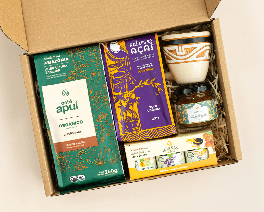 Um presente completo que expressa identidade e criatividade. Inclui mini cachaça de jambu, geleias com sabores amazônicos, um café agroflorestal orgânico e uma mini-xícara marajoara. Tudo isso apresentado em um lindo cesto trançado do povo indígena Baniwa. Um brinde que traz a riqueza natural e cultural da região em cada detalhe.